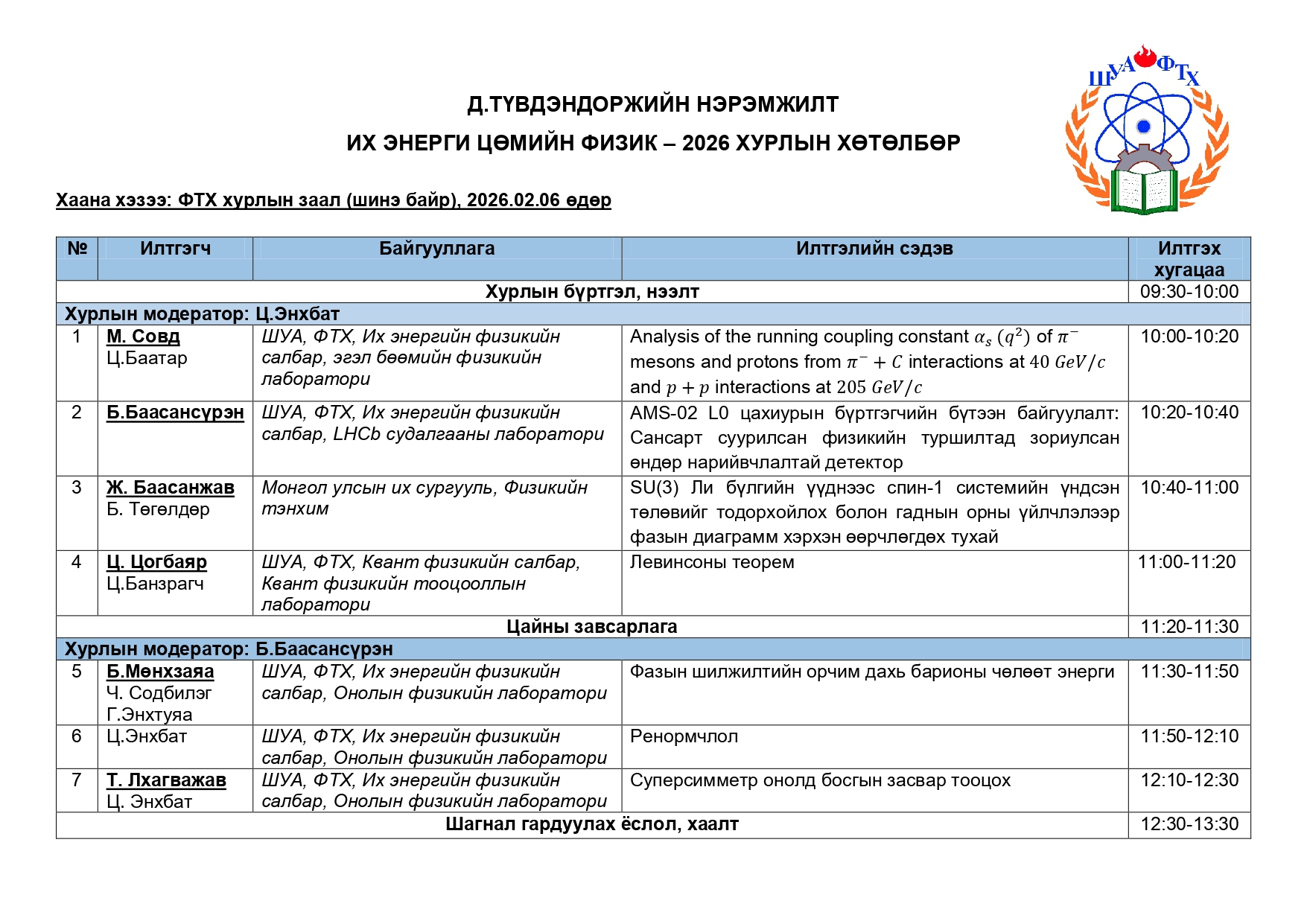 Та бүхнийг 2026 оны 02 сарын 06 өдөр болох "ИХ ЭНЕРГИ ЦӨМИЙН ФИЗИК - 2026" эрдэм шинжилгээний хуралд хүрэлцэн ирэхийг урьж байна.