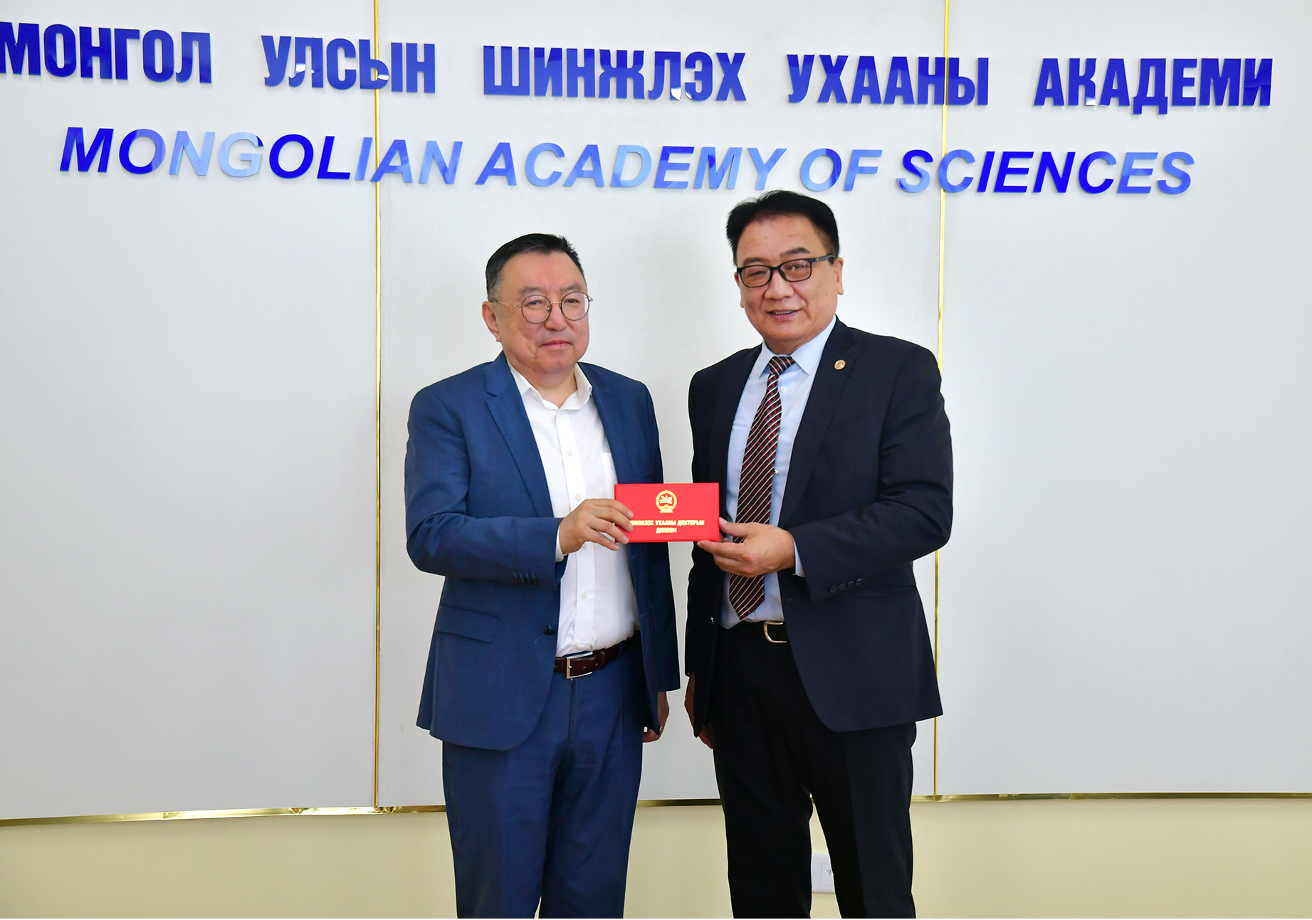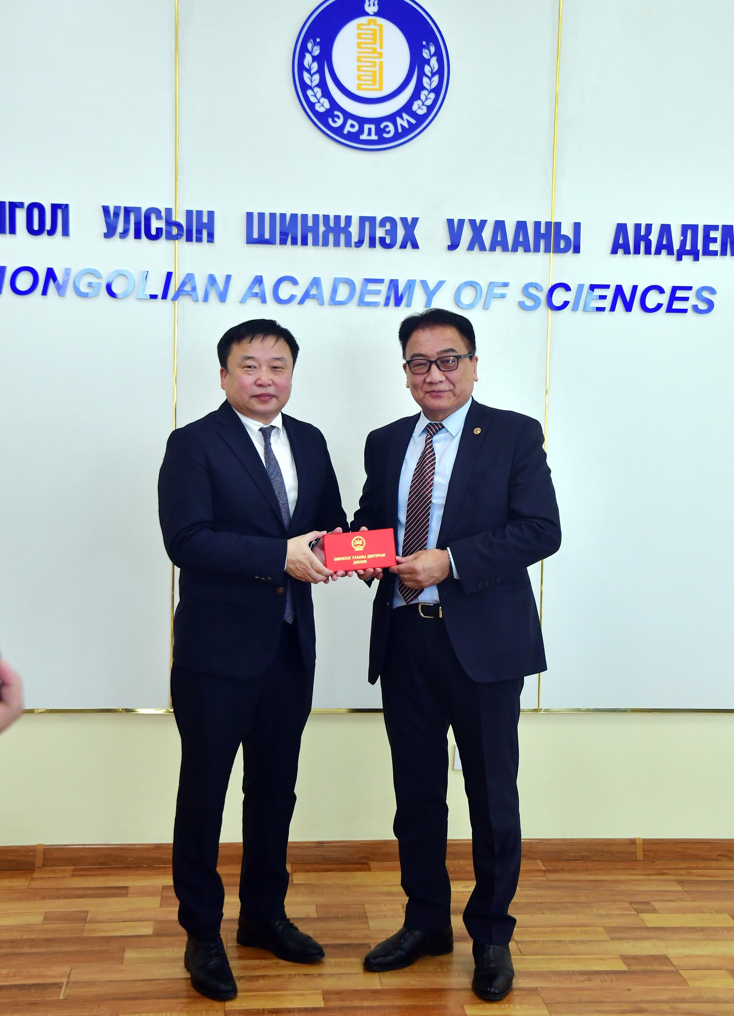 МУИС-ийн Шинжлэх ухааны сургуулийн Утга зохиол, урлаг судлалын тэнхимийн профессор Г.Галбаяр “Монгол шүлгийн тогтолцооны судалгаа” сэдвээр Хэл бичгийн шинжлэх ухааны докторын зэрэг, ОХУ-ын Бурядын Үндэсний Их Сургуулийн профессор Матханов Иринчей Эдуардович “Ургамлын гаралтай адаптоген бэлдмэлийн тамиржуулах үйлдлийг судалсан үр дүн” сэдвээр Анагаахын шинжлэх ухааны докторын зэрэг хамгаалав. Өнөөдөр ШУА-ийн ерөнхийлөгч, академич С.Дэмбэрэл эдгээр судлаачдад шинжлэх ухааны докторын зэргийн диплом гардуулж, цаашдын эрдэм судлалын ажилд нь амжилт хүсэв. Академич С.Дэмбэрэл монголын шинжлэх ухааны докторын зэрэгтэй эрдэмтдийн эгнээ шинэ судлаачдаар өргөжиж байгаад талархаж байгаагаа илэрхийлэв.